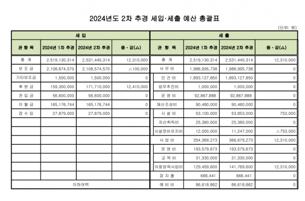 사회복지법인 충북사회봉사회 이사회 의결을 얻은 충북육아원 2024년 2차 추가경정예산서를 아래와 같이 고시합니다.