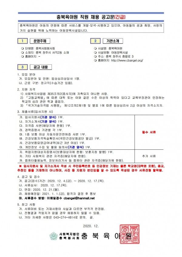 충북육아원 임상심리상담사 모집 공고(긴급)