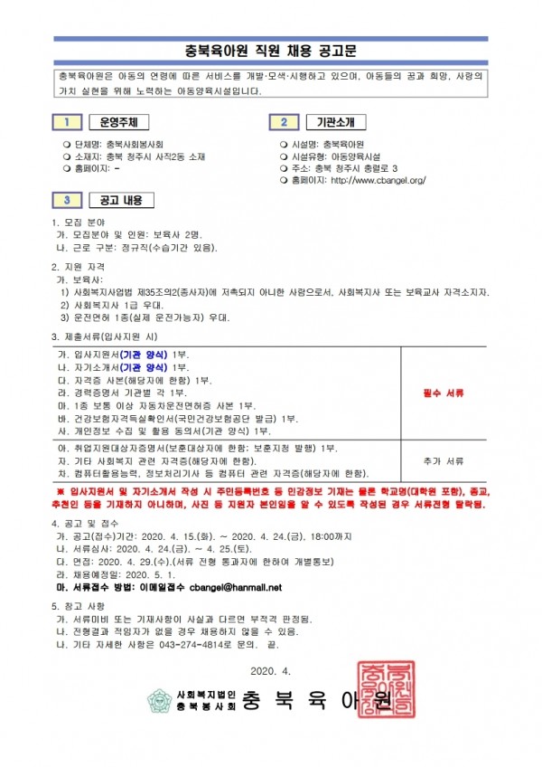 충북육아원 보육사 모집 공고