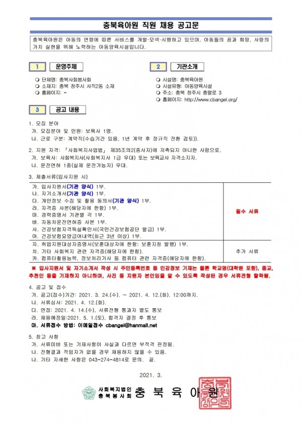 충북육아원 생활지도원(보육사) 모집 공고
