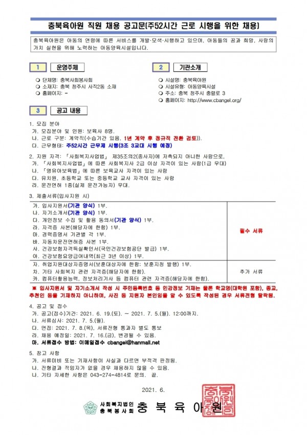 충북육아원 보육사 채용 공고(주52시간 시행을 위한 채용)