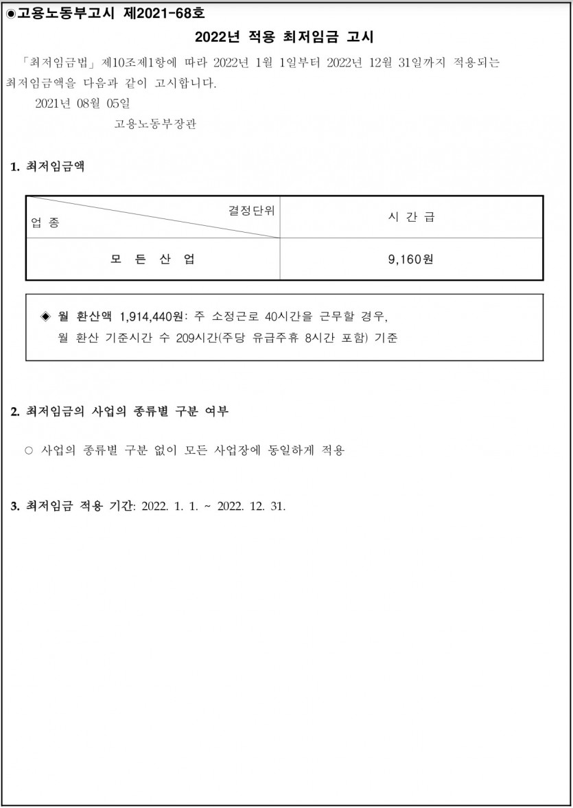 2022년 적용 최저임금 고시