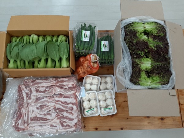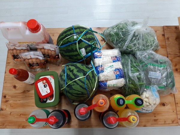 행복봉사단에서 점심식사로 맛있는 삼겹살과 음료수 그리고 빵을 후원해주셨습니다.