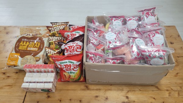 후원물품(과자, 빵, 음료)를 전달해 주셨습니다.