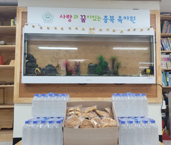 한국자유총연맹 청주시지회에서 후원물품(생수, 빵)을