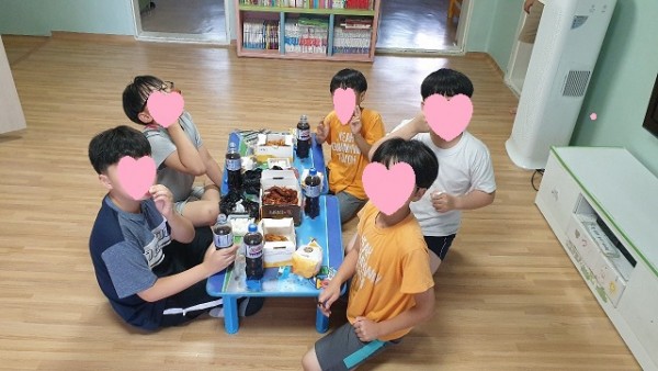 2021.07.16. 삼복이 찾아오고 있는 무더운 여름! 먹방 유튜버 햄지가 우리 아동들이 좋아하는 간식을 양손 가득 들고 방문하였습니다. 삼삼오오 모여 오늘 하루 있었던 일들을 서로 이야기 하며 치킨과 햄버거, 음료수를 맛있게 먹는 즐거운 간식 시간을 보냈습니다. 감사합니다.