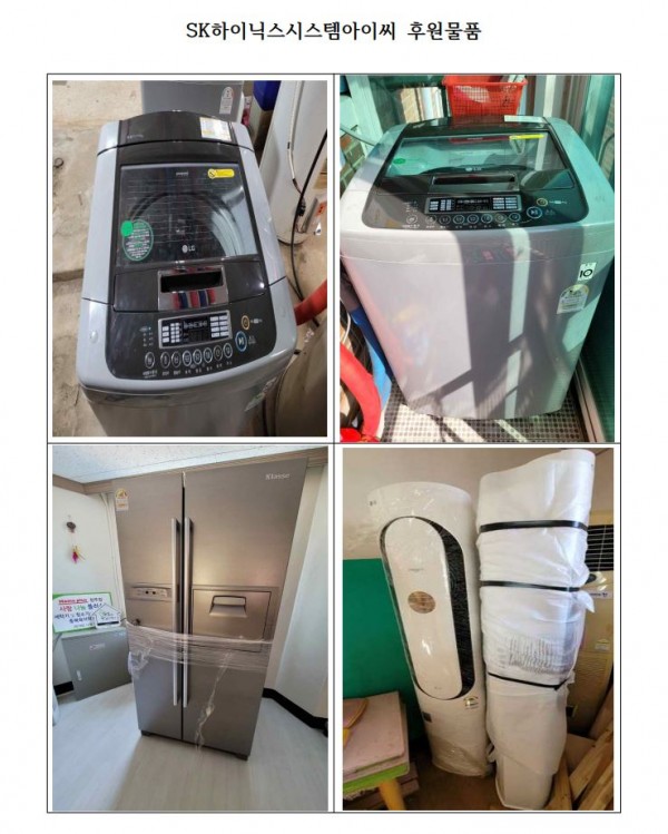 SK하이닉스시스템아이씨에서 우리 아동들의 편리한 생활을 위해 세탁기 2대, 트윈에어컨 2대, 냉장고 1대, 청소기 1대를 후원해 주셨습니다. 생활동에 누후된 가전제품을 교체하여 우리 아동들의 일상생활에 편리함을 더 하게 되었습니다. 정말 감사드립니다.