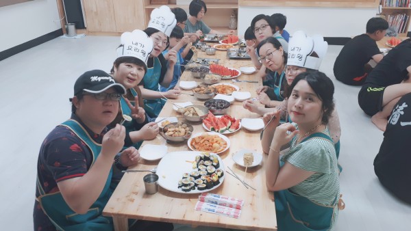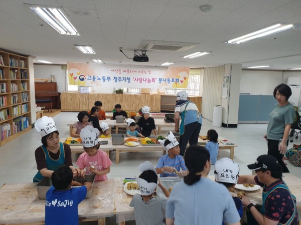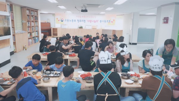 <내가 요리왕~~>우리 아동들이 좋아하는 요리체험 프로그램을 가지고 고용노동부 청주지청<사랑나눔회>봉사동호회 회원님들이 우리 원을 첫 방문하셨습니다. 김밥, 어묵탕, 떡볶이 재료들을 푸짐하게 준비해 오셔서 우리 아동들과 맛있는 토요일 점심을 직접 만들어 먹었습니다. 모두들 <내가 요리왕> 쉐프 모자를 쓰고 진지하게 음식을 만드는 모습이 기특하고 재미있었습니다.