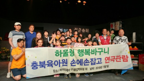7월 7일(토), <하울링행복바구니>의 후원으로 즐거운 문화행사를 진행하였습니다. <장군슈퍼>연극도 관람하고 회원님들과 함께 귀원하여 맛있는 치킨파티를 하며 친교의 시간을 가졌습니다. 우리 아동들에게 연극문화체험의 기회를 마련해 주신 <하울링행복바구니>회장님과 회원님들 모두 감사드립니다.