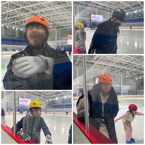 머리에 맞는 헬멧을 직접 고르고, 스케이트를 신고 빙상장에 입장하여 본격적으로 타기 시작했습니다.