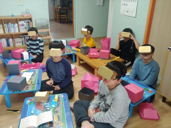VR카드보드 완성해서 착용했을 때 너무 멋있고, 사물이 크게 보여 신기해 하며 만들기를 잘 했다고 좋아했습니다.