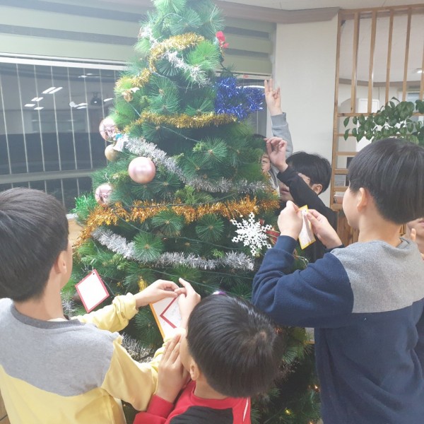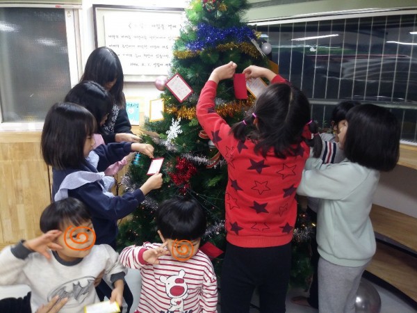 산타할아버지가 가져올 선물을 기다리며 산타 할아버지께 쓴 편지를 트리에 걸고