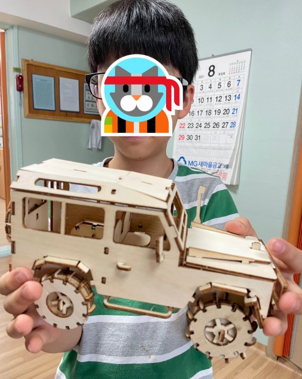 이번에는 "3D 나무 입체 퍼즐 만들기"를 하였는데, 각자 직접 선택한 오토바이, 포크레인, 헬리콥터, 항공모함, SUV자동차, 공작새, 전투기, 타워브릿지 등을 집중해서 만들었습니다.